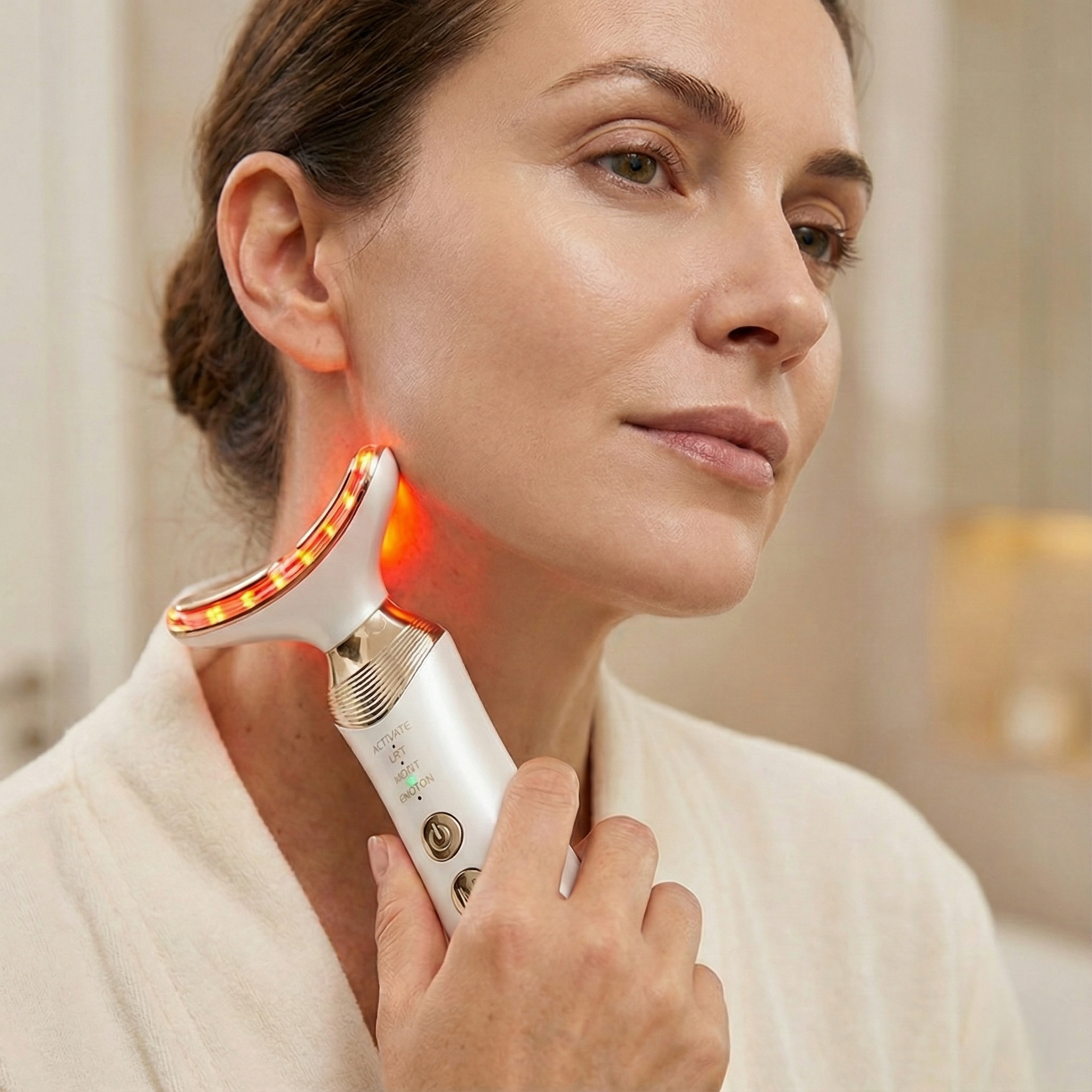 A luxurious skin-renewing tool that targets the delicate neck, jawline, and face. With 24K gold plating, EMS microcurrent, and 5 LED colours, this device helps firm, brighten, and refine your contours with ease.